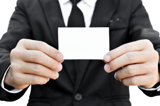Businessman hand holding white business card isolated on transparent background - PNG format.
