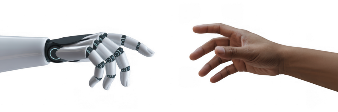 Robotic hand and human hand reaching for each other isolated on a transparent background
