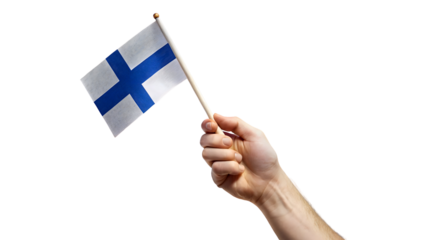 A hand holding a small Finnish flag against a black background