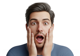 Surprised young man with open mouth making wow expression isolated on transparent background