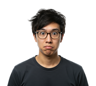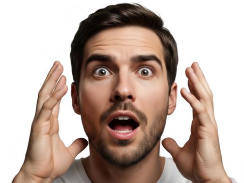 Shocked man expressing surprise in emotional reaction portrait isolated on transparent background
