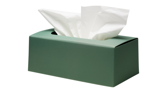 A green tissue box with white tissue paper isolated on transparent white background, clipping path