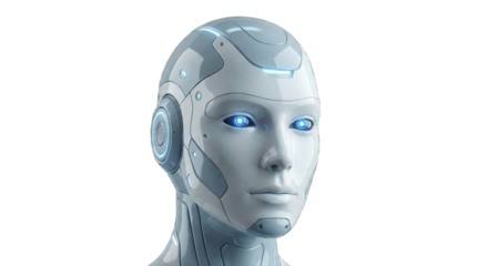 Futuristic humanoid robot head with glowing blue eyes, isolated on transparent background, symbol of artificial intelligence and advanced technology