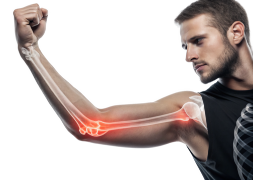 Close-up, realistic image of a human arm with a transparent X-ray effect revealing the bones, specifically focusing on the elbow join isolated on a transparent background.