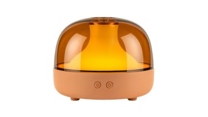 Warm amber essential oil diffuser with rounded glass dome and copper base, Isolated on white or transparent PNG.