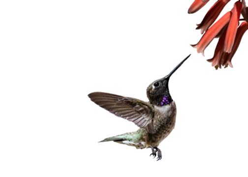 Black-Chinned Hummingbird (Archilochus alexandri), Photo, on a Transparent Background, Feeding on an Aloe Vera Bloom