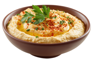 Creamy hummus dish with chickpeas olive oil paprika and pita bread isolated on transparent background