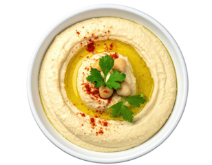Bowl of hummus with olive oil paprika and parsley served with grilled pita bread isolated on a transparent background