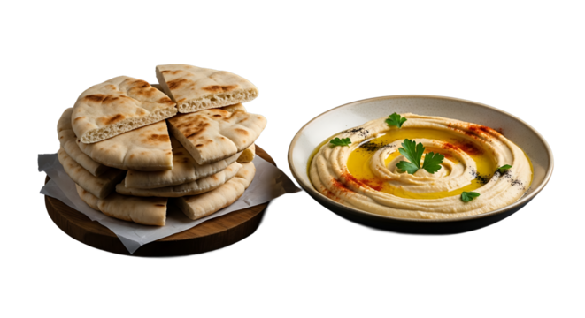 A bowl of creamy hummus with olive oil drizzle and pita bread, solated on transparent background, PNG file