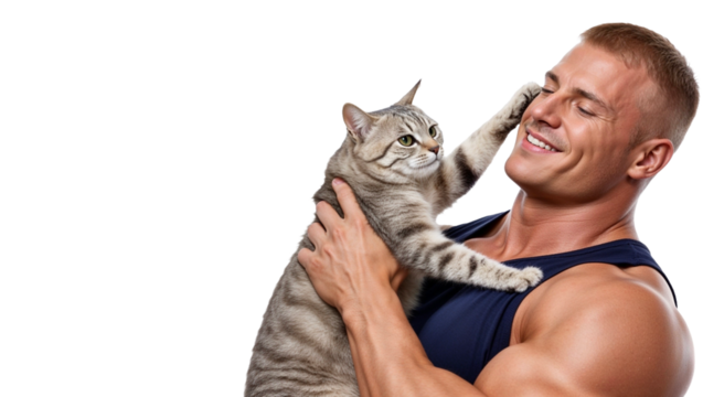 Photorealistic Portrait of Muscular Man and Cat Interaction png