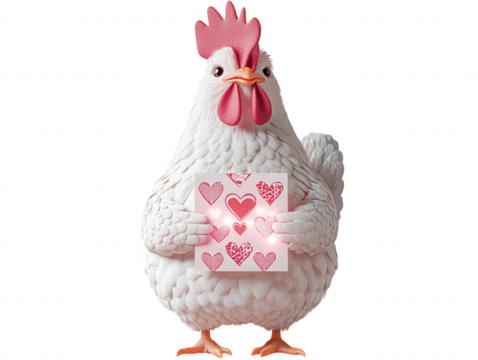 Whimsical Chicken Character Holding Heart Patterned Card, Perfect for Fun Illustrations, Cute Designs, and Playful Themes in Creative Projects