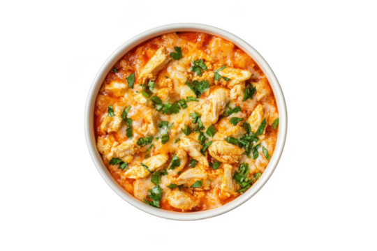 Delicious chicken paprikash stew with fresh parsley garnish in white bowl stock photo, food photography isolated on transparent background