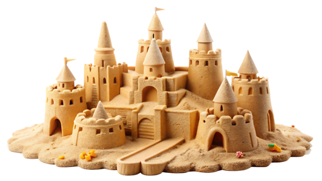 Intricate Sandcastle with Towers and Flags on Background beach summer isolated on a transparent background