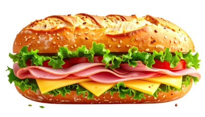 A scrumptious sandwich, showcasing layers of fillings nestled inside a toasted, seeded roll