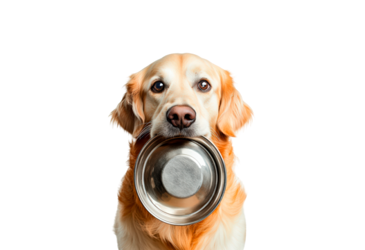Golden retriever holding a bowl in its mouth isolated on transparent background