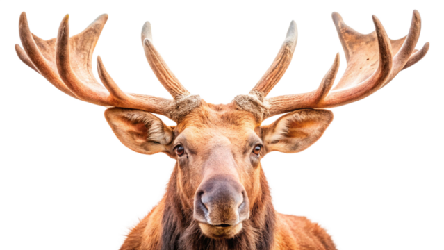 Close-up portrait of a majestic moose with antlers, captured in natural light, isolated on a white background