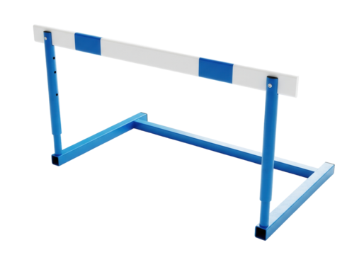 A professional blue track and field hurdle with a striped white and blue top bar is on a clean white surface. Isolated transparent background ( cut-out PNG file ).