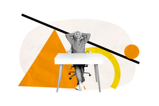 Composite trend artwork sketch image collage of element geometry hurdle small aged lady sit table office armchair relax comfort triangle