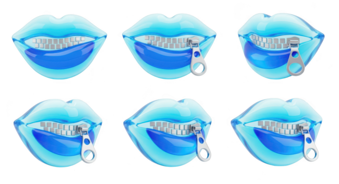 Blue glossy lips sealed with zipper action shot studio white background symbolizing silence or privacy for concepts