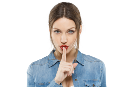 Young woman in lavender top making quiet gesture transparent background