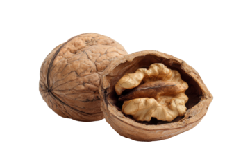 Whole and cracked walnut with kernel visible isolated on transparent background. Walnut cracked open showing kernel and whole nut isolated on white background.