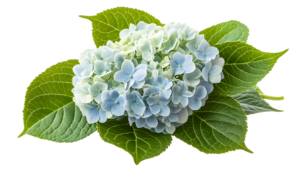 Isolated Light Blue Hydrangea Blossom Surrounded by Fresh Green Leaves on White Background