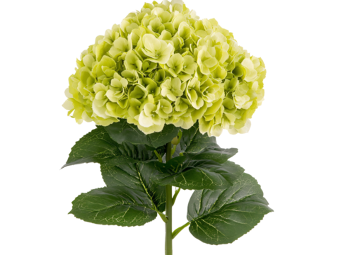 Hydrangea macrophylla mix set including blooming heads and green foliage, top view style,Transparent background, PNG file