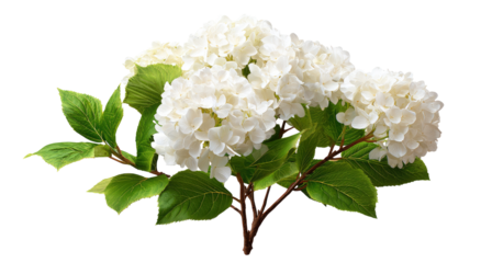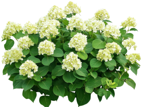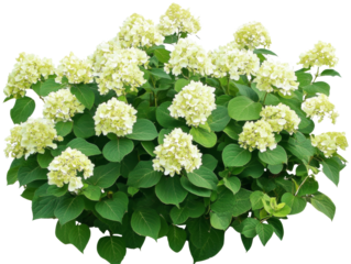 Cut out hydrangea. White flowers isolated on transparent background. Bush for garden design or landscaping