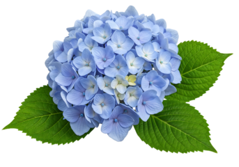 A beautiful arrangement of vibrant blue and purple hydrangea flowers with green leaves, isolated on transparent background.