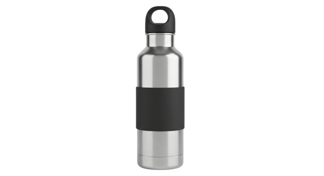 Stainless steel water bottle with a black grip isolated on transparent background, perfect for staying hydrated during outdoor activities and workouts