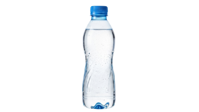 Clear plastic water bottle isolated PNG, refreshing drink container with blue cap on transparent background, hydration and beverage