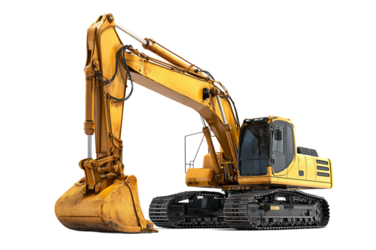Yellow excavator PNG isolated on transparent background, heavy construction equipment for digging and earthmoving projects