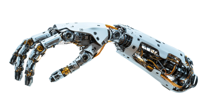 Futuristic Metallic Robotic Arm with Hydraulic Tubes on White Background