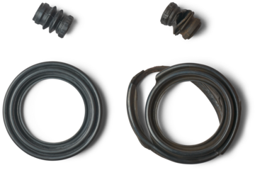close-up of new and old brake caliper pin and piston boots, crucial components in car hydraulic braking system, regular inspection and maintenance concept isolated on white background
