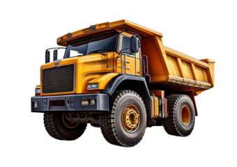 Bright yellow wheel loader's front, massive black and yellow bucket, rugged tires, gleaming hydraulic cylinders on transparent, studio lit, concept of industrial might