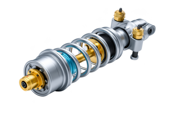Shock absorber featuring coils and hydraulic components for vehicle suspension. Png, Transparent background.