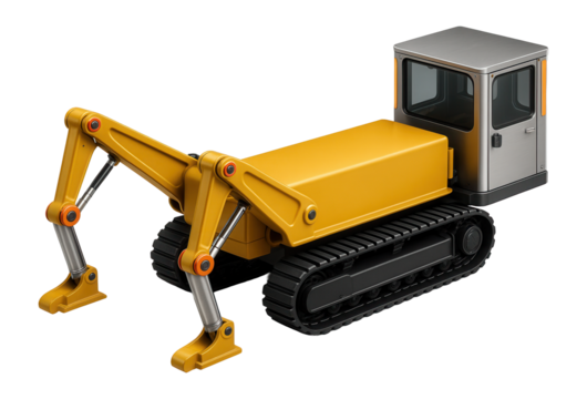 Yellow excavator with tracks, side view on a solid background