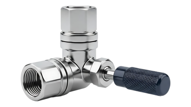High-quality stainless steel valve with threaded connection and ergonomic black handle for precise control on transparent background