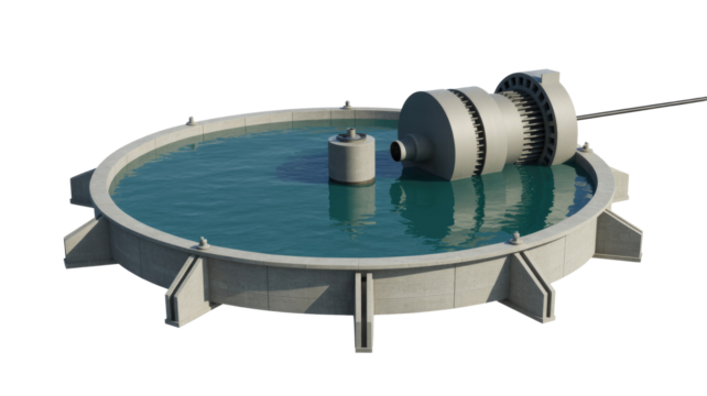 A 3D render of a concrete water treatment basin with a submerged pump or turbine and central pillar, set against a transparent background. background removed
