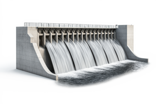 A large hydroelectric dam with water powerfully spilling over its gates, generating clean energy. Essential infrastructure for sustainable power. background removed