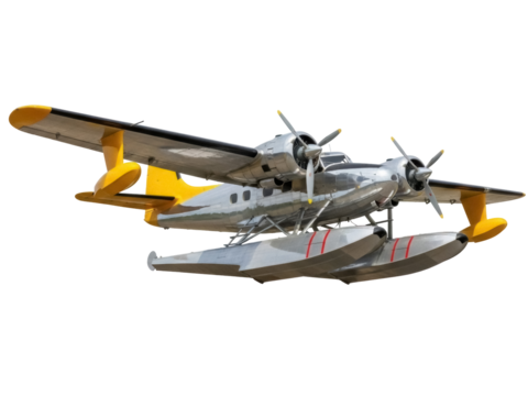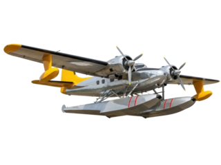 Isolated vintage seaplane amphibian airplane, chrome and yellow, propeller, floatplane