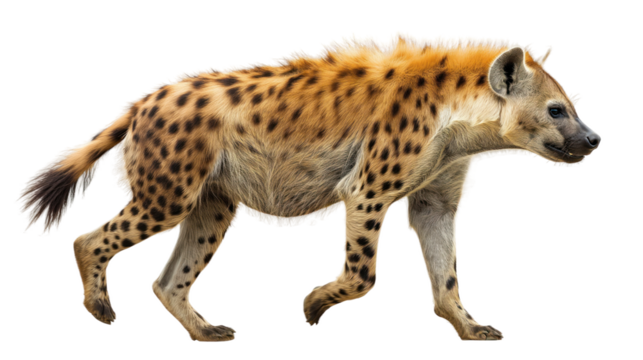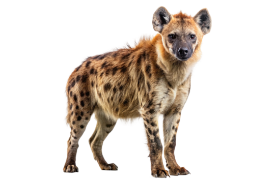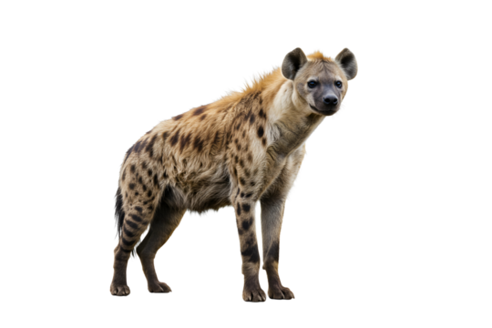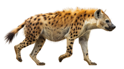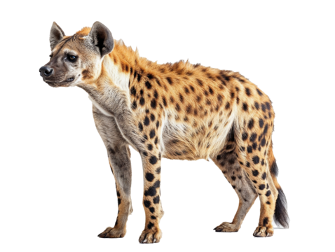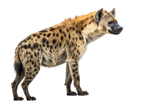 Vector color illustration of adult hyena standing, walking. African spotted wild animal isolated on white background. Wildlife of Africa.