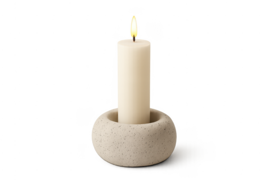 White burning candle in modern concrete holder