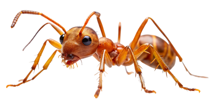 Closeup macro photograph of a reddishbrown ant with visible antennae, mandibles, and segmented body, isolated on transparent background