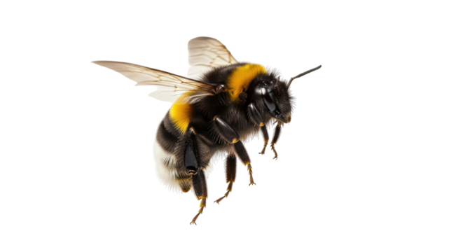 Closeup of a fuzzy bumblebee with yellow and black stripes isolated on transparent background