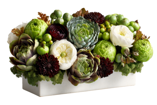 Modern floral arrangement, white ranunculus, burgundy dahlias, sage succulents, green hypericum berries and moss in white rectangular planter on isolated transparent background.
