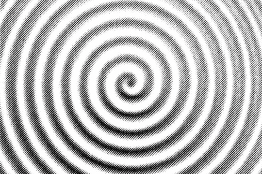 Macro of printed spiral rings in black halftone on transparent PNG, forming a hypnotic vortex or tunnel effect in bold monochrome.