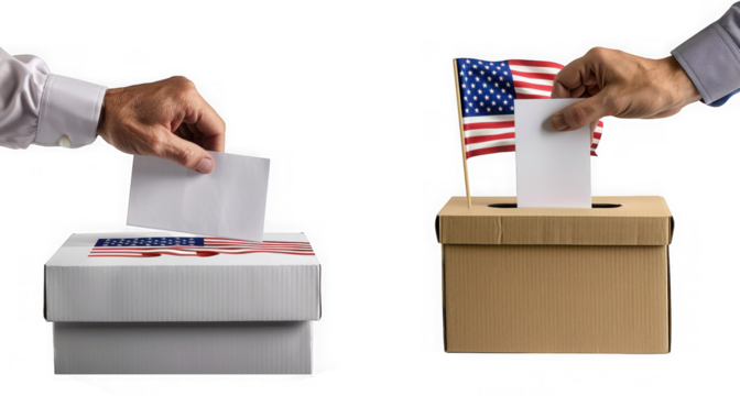 Hands casting ballots into two different ballot boxes, one white and one cardboard box with an american flag, isolated on white isolated on transparent background