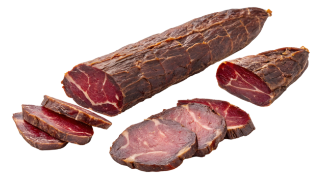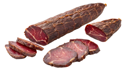 Set of Sliced Chorizo Spanish sausage isolated on white transparent background. Concept of cured meats