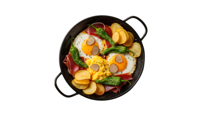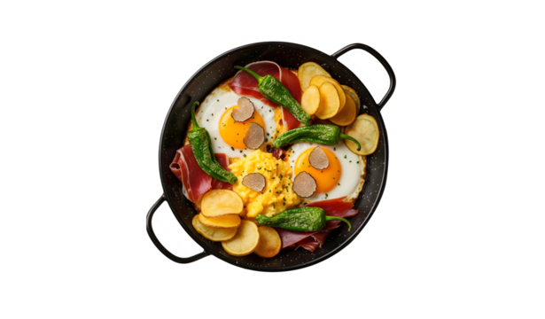 Tasty traditional Spanish meal featuring broken eggs, serrano ham, fried peppers, homemade chips, and truffle served in a black enameled pan on a light table.